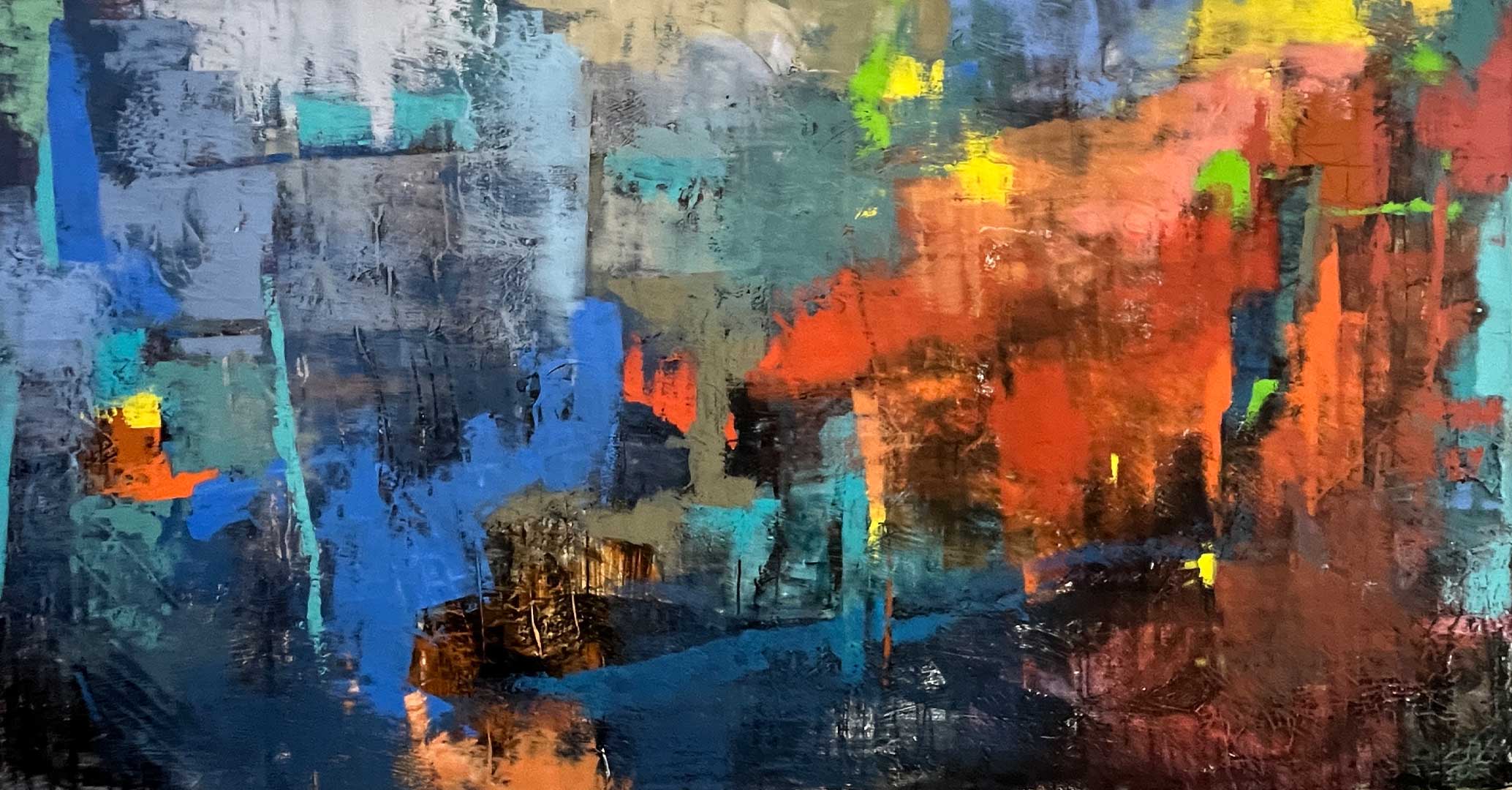 Schichtweise Farbaufträge schaffen einen Raum, auf den ich immer wieder neu mit dem Setzen von Kontrasten reagiere. Abstraktes Arbeiten ist ein Dialog aus Rufen und Antworten. Die Geste führt den Prozess, während das ordnende Element Grenzen setzt und geometrische Unterbrechungen fordert. Mich interessiert das Spannungsfeld zwischen Chaos und Ordnung – ihr ständiges Austarieren, bis ein bewegtes Gleichgewicht entsteht.